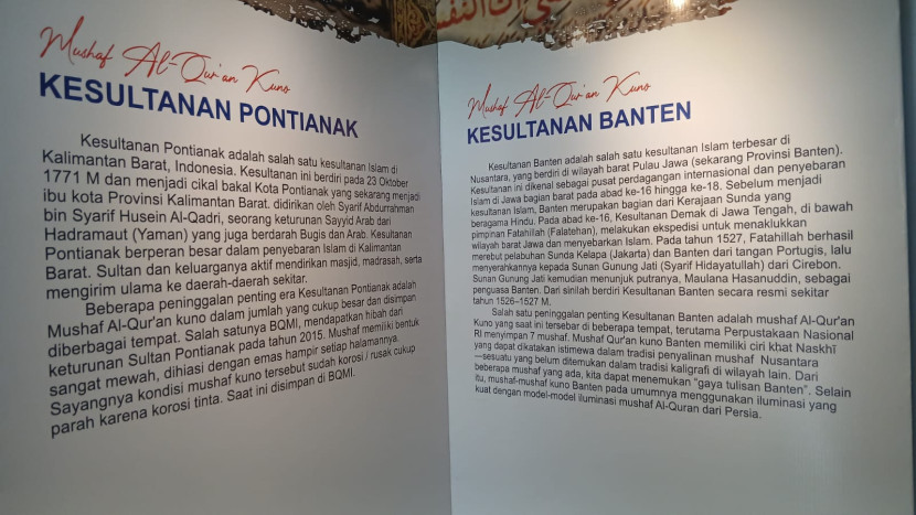 Dalam pameran tersebut, pengunjung dapat melihat berbagai replika mushaf kuno dari berbagai masa, termasuk model mushaf zaman Rasulullah ﷺ yang masih tanpa tanda baca, serta mushaf klasik dari kerajaan-kerajaan Islam di Nusantara.