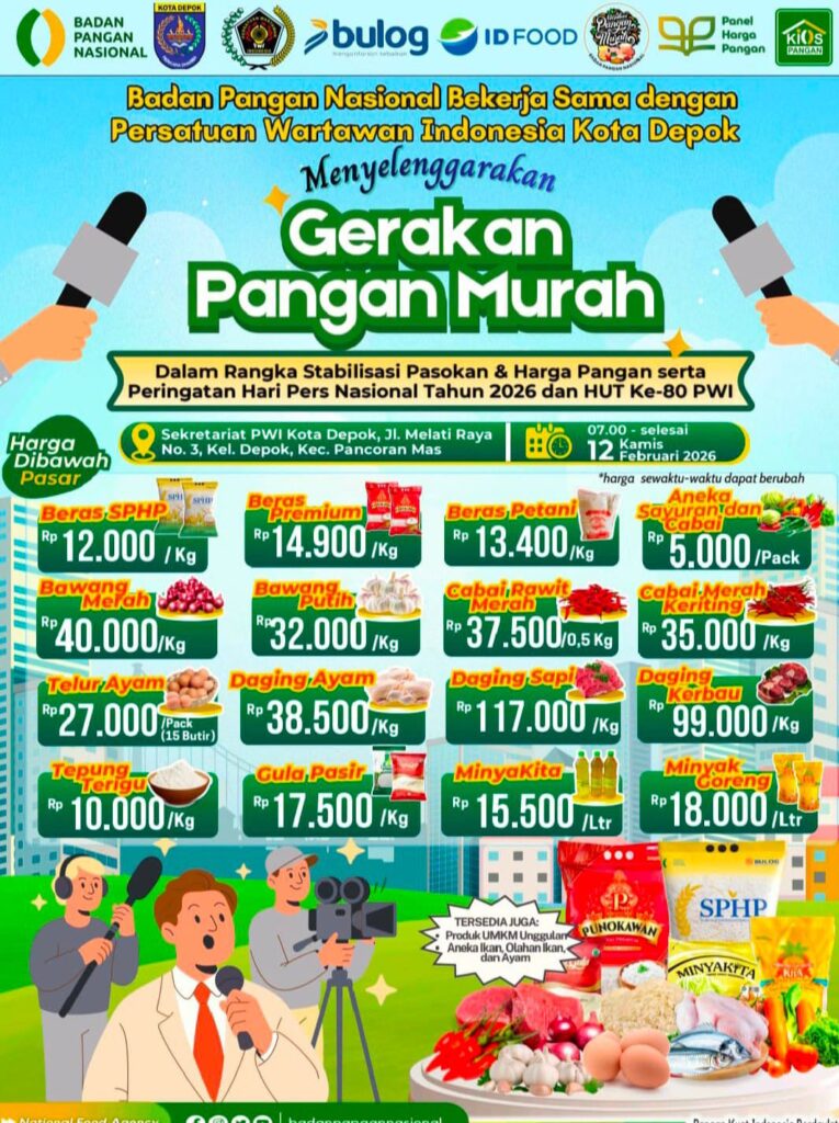 Melalui momentum Hari Pers Nasional (HPN) 2026, PWI Kota Depok bersama Badan Pangan Nasional (Bapanas) menggelar Gerakan Pangan Murah (GPM). Kegiatan ini bertujuan membantu masyarakat memperoleh kebutuhan pokok dengan harga terjangkau.