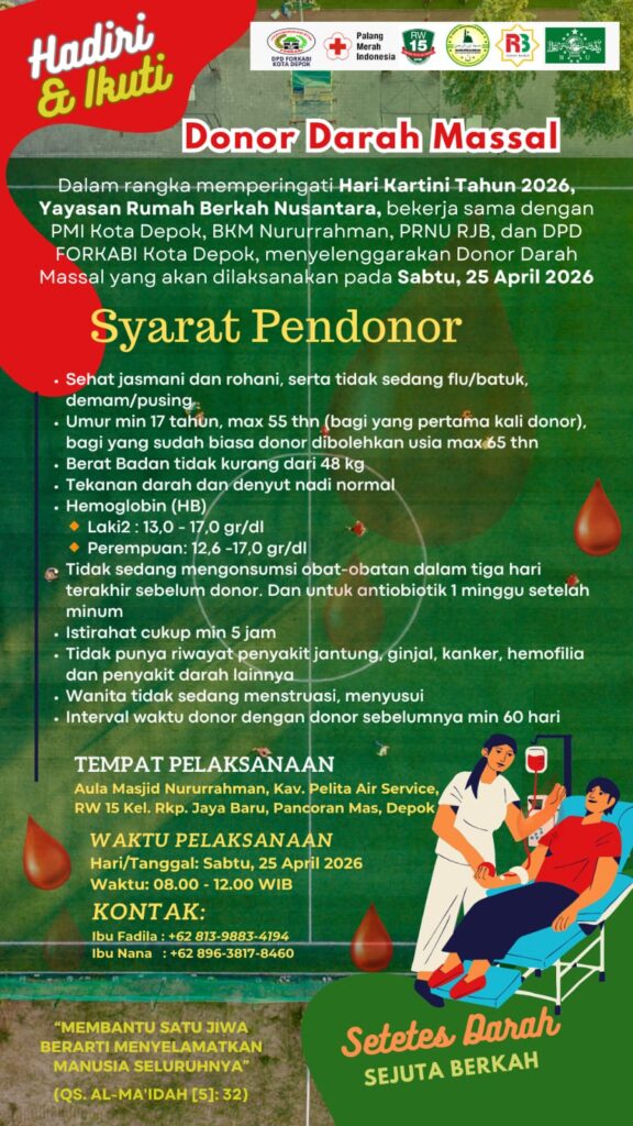 SAJADA.ID, DEPOK–Dalam rangka memperingati Hari Kartini Tahun 2026, Yayasan Rumah Berkah Nusantara menggelar kegiatan sosial berupa donor darah massal.