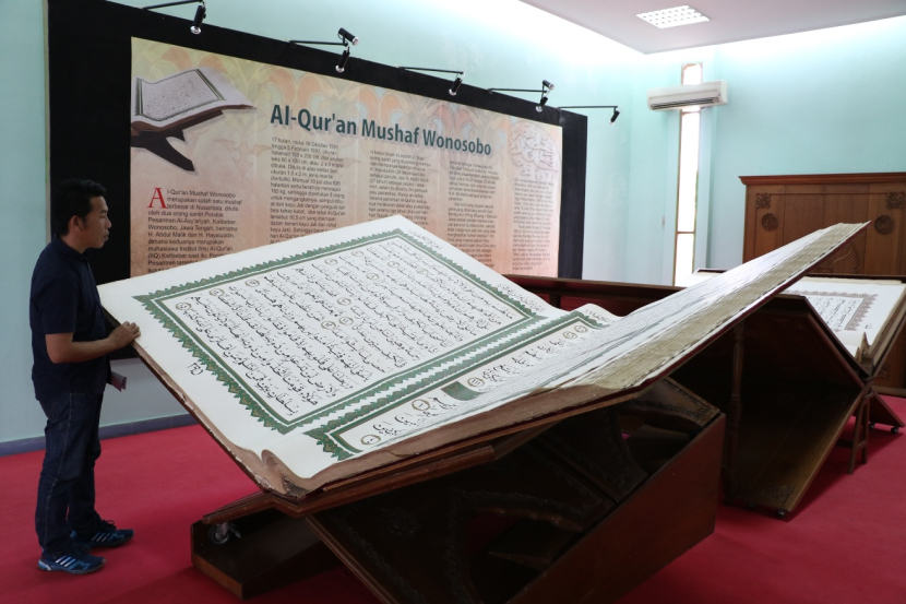 Ketiga, mushaf terbesar atau mushaf Wonosobo adalah mushaf Al-Quran raksasa dengan ukuran halaman 150 X 200 cm, ukuran teks 80 x 130 cm, atau 2 X 3 m bila dibuka. Ditulis di atas kertas manila berukuran 1,5 X 2 m dengan beratnya mencapai 165 kg. Sampulnya dibuat dari kayu jati yang dilengkapi dengan penguat dari besi tahan karat. Sehingga, berat keseluruhan mushaf Al-Qur'an beserta sampulnya sekitar 3 kuintal. Untuk mengangkatnya diperlukan 8 orang.