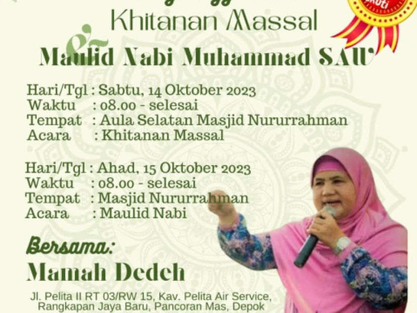 DEPOK–Ustadzah Dedeh Rosyidah atau yang akrab disapa Mamah Dedeh, dijadwalkan mengisi acara Maulid Nabi Muhammad Saw yang diselenggarakan Muslimat NU Anak Ranting RW 15 Kelurahan Rangkapan Jaya Baru, Pancoran Mas, Kota Depok. Rencananya acara akan dilangsungkan pada Ahad, 15 Oktober 2023 pukul 09.00 WIB.