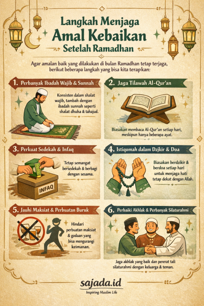 Lalu, bagaimana agar amal-amal baik yang telah dibangun selama Ramadhan tidak berhenti hanya sebagai kenangan musiman? Berikut beberapa langkah yang bisa kita jaga bersama.