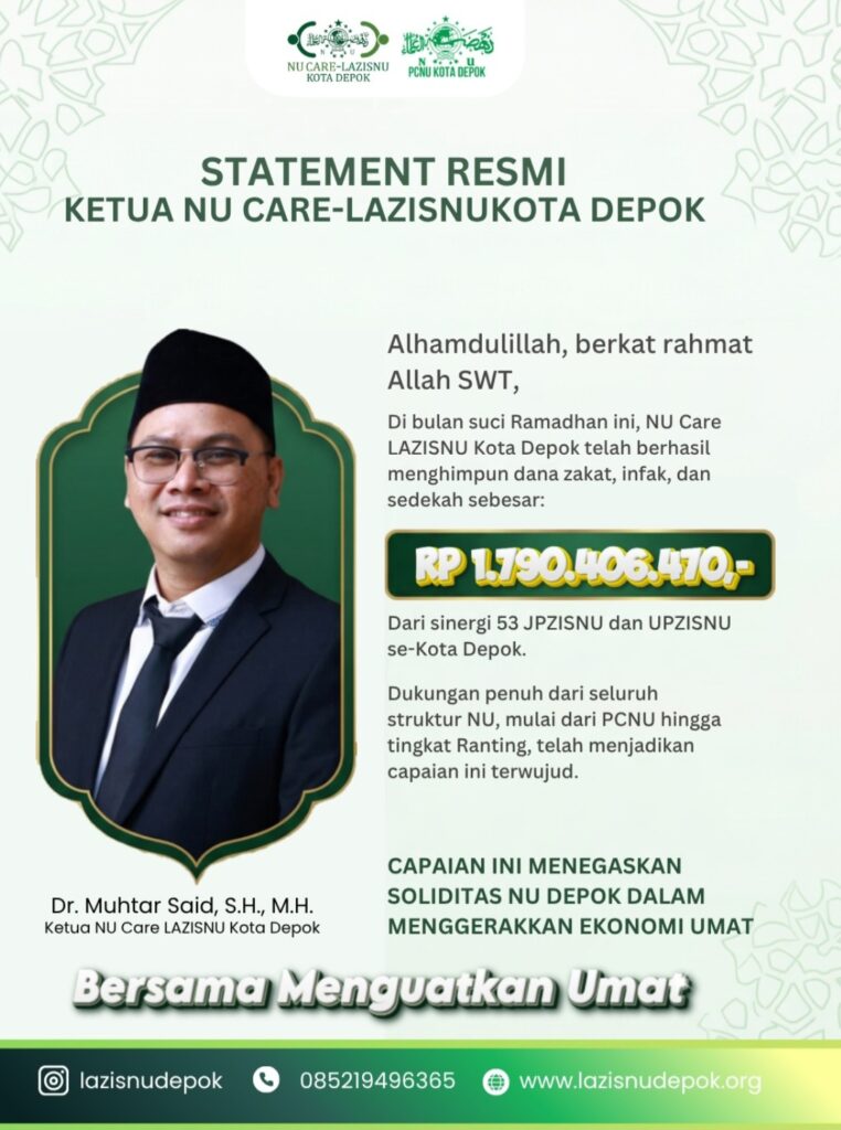 Capaian tersebut disampaikan dalam statement resmi Ketua NU Care-LAZISNU Kota Depok, Dr. Muhtar Said, S.H., M.H., yang dipublikasikan melalui media visual resmi lembaga tersebut.
