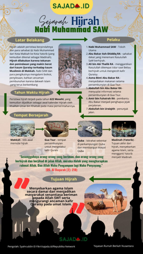 SAJADA.ID–Rasulullah SAW melaksanakan hijrah dari Makkah ke Madinah pada awal Muharram. Tahun hijrah itu kemudian ditetapkan sebagai awal kalender Islam dan Tahun Baru Islam.